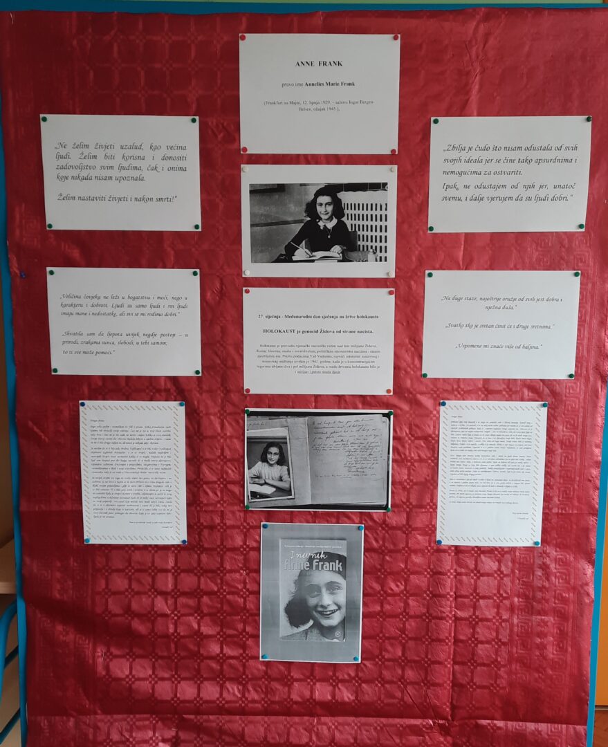 Međunarodni dan sjećanja na žrtve holokausta 27. siječanj obilježili smo na satu Hrvatskog jezika interpretirajući najpoznatiji dnevnik na svijetu – „Dnevnik Anne Frank.“ Također smo napravili i prigodni pano.